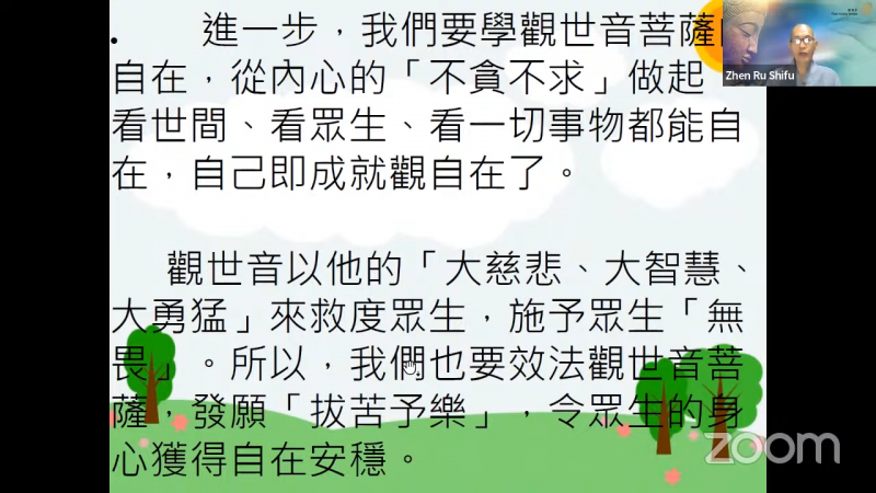 进一步,我们要学观世音菩萨的自在,从内心的「不贪不求」做起,看世间、看众生、看一切事物都能自在,自己即成就观自在了。