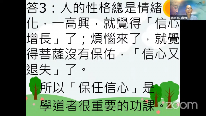 法师表示,人的性格总是情绪化,一高兴,就觉得「信心增长」了;烦恼来了,就觉得菩萨没有保佑,「信心又退失」了。所以「保任信心」是学道者很重要的功课。