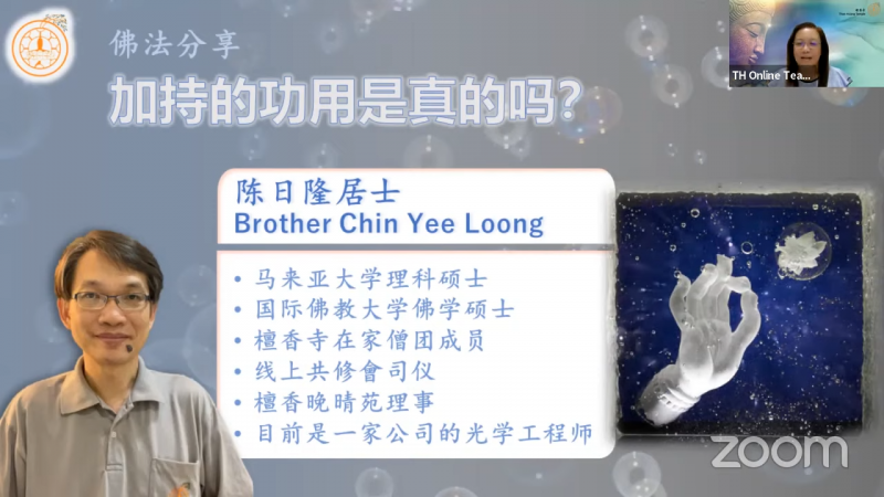 陈日隆居士是檀香寺在家僧团成员,早年考获马大理科硕士以及国际佛教大学佛学硕士,目前任职光学工程师。