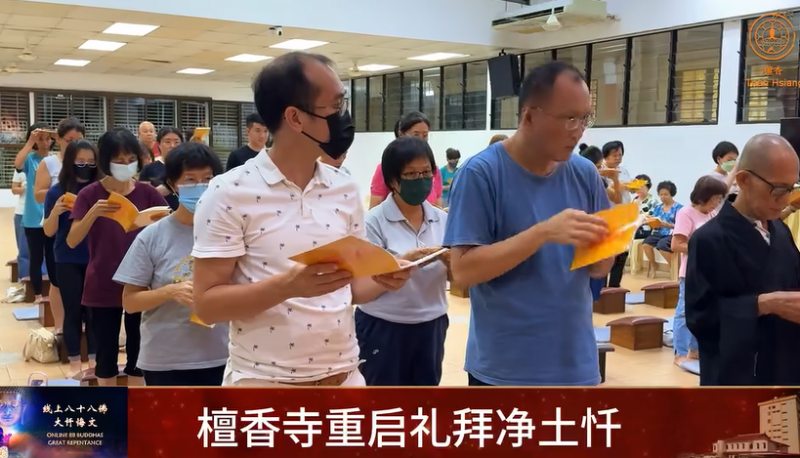 阔别三年多后,檀香寺于27.07.2024 星期六 8:00pm 重启礼拜净土忏的修持活动。出席人数约50名,虽然不如预期的多,却已经是挺振奋人心了!忏会在四位比丘尼及一名沙弥尼带领下准时于晚上八时准时开始,于九时四十分圆满结束。大家齐声唱赞、诵《阿弥陀经》、诵《往生咒》、礼佛、拜愿;在磬声、钟声、木鱼声的引领下,虔诚地拜下去、站起来又跪下去。啊!真是法喜充满!