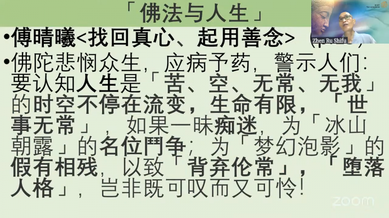 谈到「佛法与人生」的关系,傅晴曦居士也在其著作《欣赏报恩世界》中的〈找回真心、起用善念〉中提到,佛陀悲悯众生,应病予药,警示人们要认知人生是「苦、空、无常、无我」的。时空不停在流变,生命有限,世事无常,如果一昧痴迷,为「冰山朝露」的名位鬥争,为「梦幻泡影」的「假有」相残,以致「背弃伦常」、「 堕落人格」,岂非既可叹而又可怜!