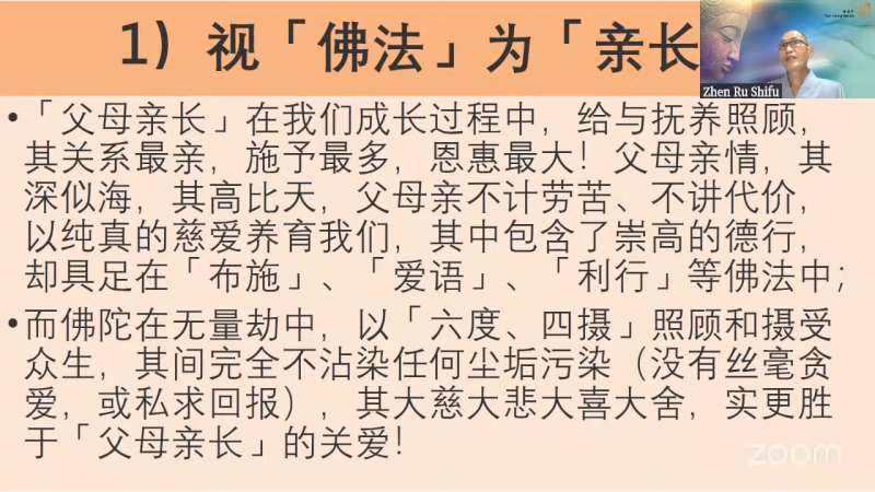 父母亲长在我们成长过程中,给与抚养照顾,其关系最亲﹑施予最多﹑恩惠最大!父母亲情,其深似海﹑其高比天,父母亲不计劳苦、不讲代价,以纯真的慈爱养育我们,其中包含了崇高的德行,却具足在「布施」、「爱语」、「利行」等佛法中; 而佛陀在无量劫中,以「六度」、「四摄」照顾和摄受众生,其间完全不沾染任何尘垢污染(没有丝毫贪爱,或私求回报),其大慈大悲大喜大舍,实更胜于父母亲长的关爱!