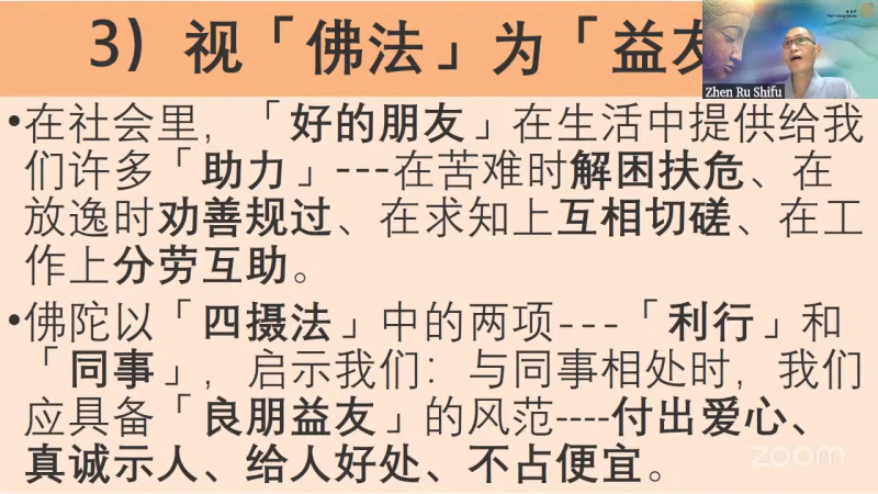 佛陀以「四摄法」中的两项 —「利行」和「同事」启示我们:与同事相处时,我们应具备「良朋益友」的风范 — 付出爱心、真诚示人、给人好处、不占便宜。
