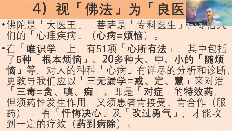 在「唯识学」上,有 51 项「心所有法」,其中包括了 6 种「根本烦恼」以及 20 多种大、中、小的「随烦恼」等,对人的种种「心病」有详尽的分析和诊断,更教导我们应以「三无漏学」(戒、定、慧)来对治「三毒」(贪、嗔、痴)。即是「对症」的特效药,但须药性发生作用,又须患者肯接受、肯合作(服药),有「忏悔决心」及「改过勇气」,才能收到一定的疗效(药到病除)!