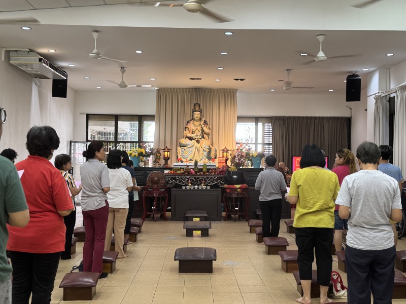 在这一天,信众们早早来到寺院,到大悲殿、大雄殿礼佛,供灯﹑供花﹑供养米、盐、米粉、蛋糕和糖水。此时可以看到佛桌前摆满了信众的供养。