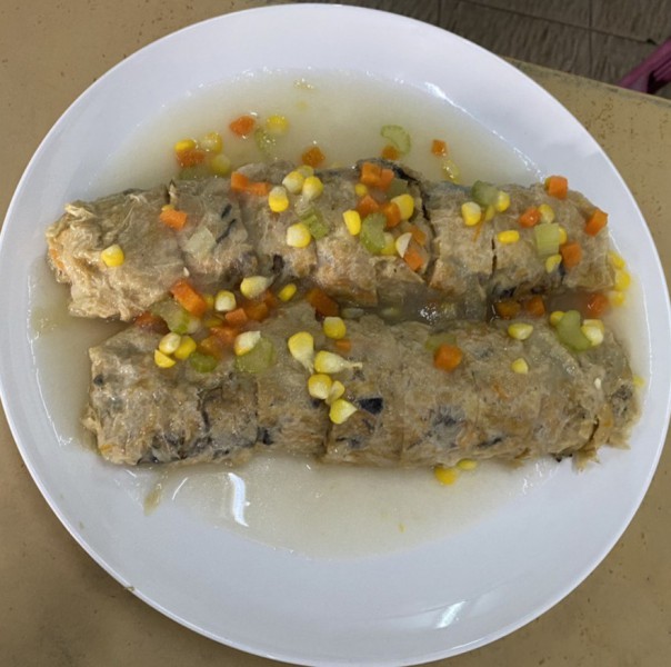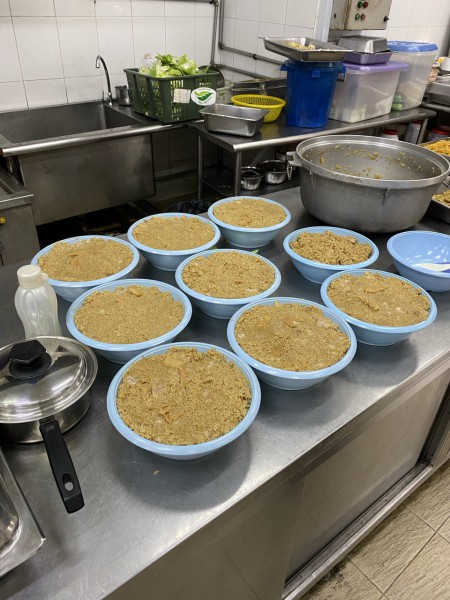 期间,招坤老师也带领大家一起准备三道菜肴: 西兰花扣三宝、古法三鲜竹香卷和滋味芋香饭。除了檀香寺食堂的义工菩萨们帮忙,招坤老师还带来了二十位义工来食堂协助膳食的前期准备。