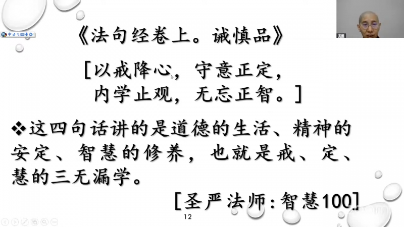 圣严法师在《智慧100》解释这 4 句话讲的是:道德的生活、精神的安定、智慧的修养,也就是戒、定、 慧的三无漏学。