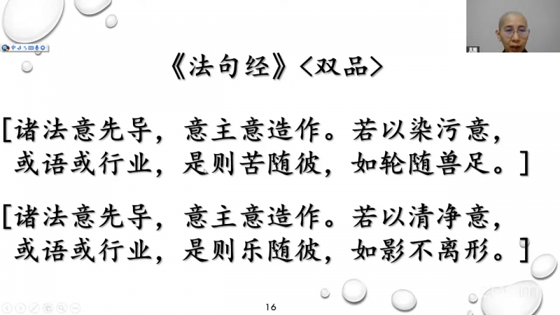 积极的一方面来说,我们必须要众善奉行,一切善的,我们要去做,这个就是有关系到五戒十善,尤其是谈到身跟口业方面,除了身跟口业方面。此外,还有一个很重要的就是自净其意,这个意代表的是我们的心念,我们要清静自己的心念。