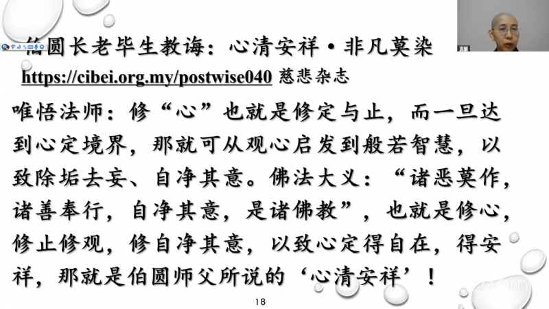 唯悟法师:修「心」也就是修「定」与「止」,而一旦达到心定境界,那就可从观心启发到般若智慧,以致除垢去妄、自净其意。佛法大义:「诸恶莫作,诸善奉行;自净其意,是诸佛教」,也就是修心,修止修观,修自净其意,以致心定得自在,得安祥,那就是伯圆师父所说的‘心清安祥’!