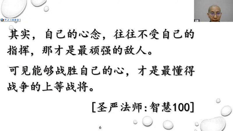 圣严法师在《智慧100》里面引用《法句经》卷上〈述千品〉:「千千为敌,一夫胜之,未若自胜,为战中上」,这个偈子是说,若以一个人的力量去战胜成千上万的敌人,当然是够勇猛的战将了;但是,还不如战胜自己的烦恼心来得有价值。