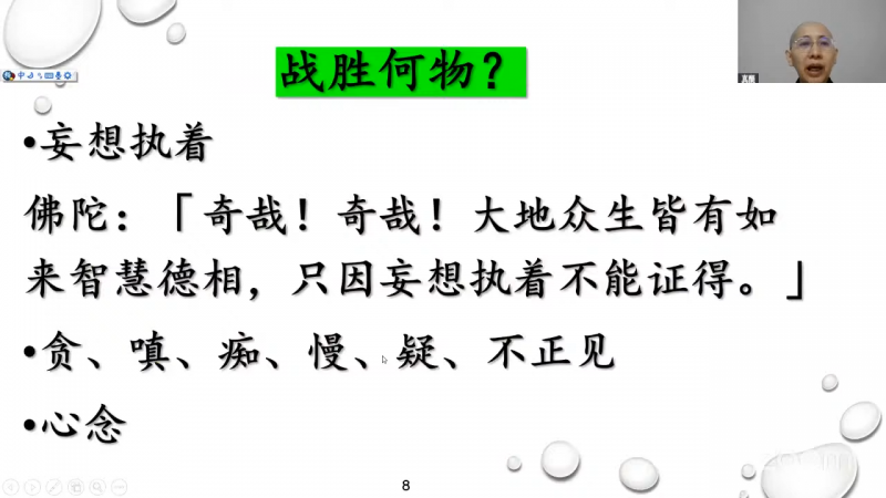 佛陀在菩提树下觉悟的时候,佛陀说道:「奇哉!奇哉!大地众生皆有如来智慧德相,只因妄想执着不能证得。」由此可见,我们要战胜的,就是我们的妄想心﹑执着心。我们的妄心太多了,不要的﹑不需要的,我们也想要。