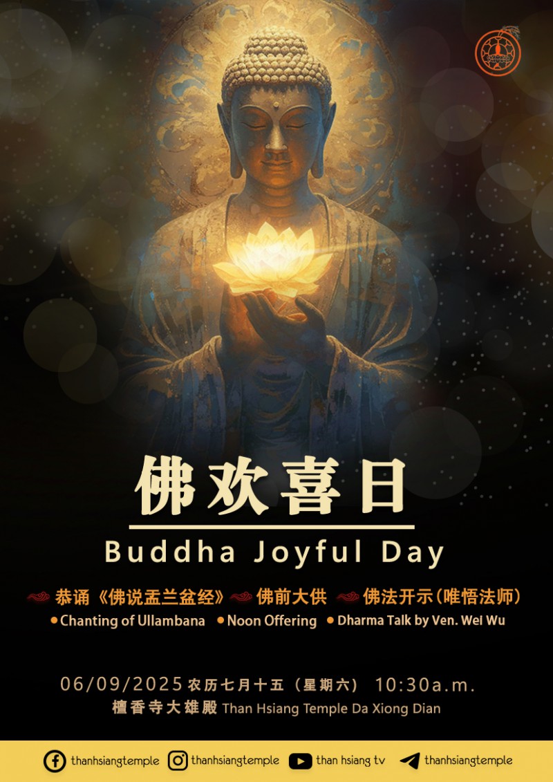 Submitted by MeiYue on Tue, 29/07/2025 - 14:40 Body: >佛欢喜日 恭诵《佛说盂兰盆经》 、佛前大供 、 佛法开示(唯悟法师) 日期 : 农历七月十五 (06.09.2025)时间 : 10.30a.m.地点 : 檀香寺大雄殿 将佛学讯息传递出去,以接引更多人学佛,继续在学佛道路上精进,听经闻法。 欲知详情,请点击以下连接:https://linktr.ee/thanhsiang 宣传 Log in to post comments844 reads