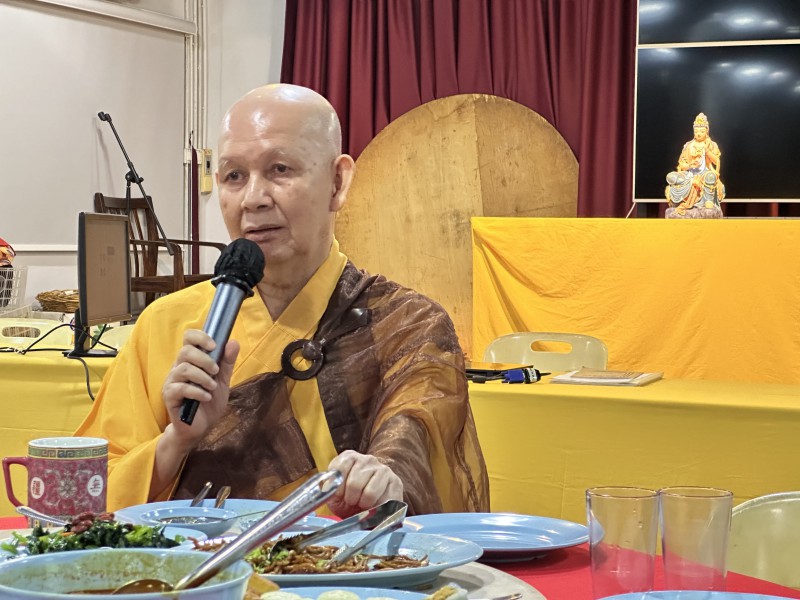 南北传法师们随后开始用餐。用餐结束后,居士们依次供养法师们红包与礼包,场面温馨庄重。 本寺开山唯悟法师随后为大众开示。法师提到,今年的斋僧会为小规模形式举行,参与供养者多数为本寺信徒。今年适逢闰月,佛前大供将于农历七月十五日举行。届时,法师将开示《佛说盂兰盆经》及其深义。 农历七月十五日为盂兰盆节,亦是庆祝出家人结夏安居三个月后的自恣日,意义殊胜。在开示中,唯悟法师诚邀大众于农历七月十五日当天前来参与上供,共沐法喜。