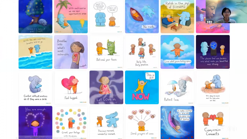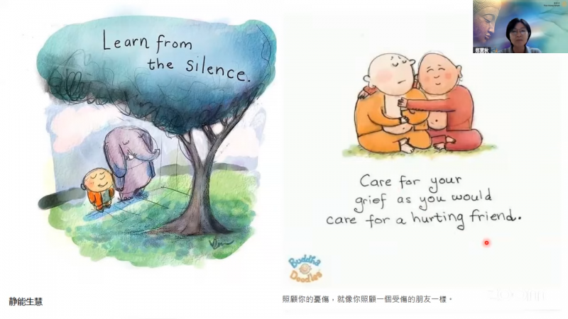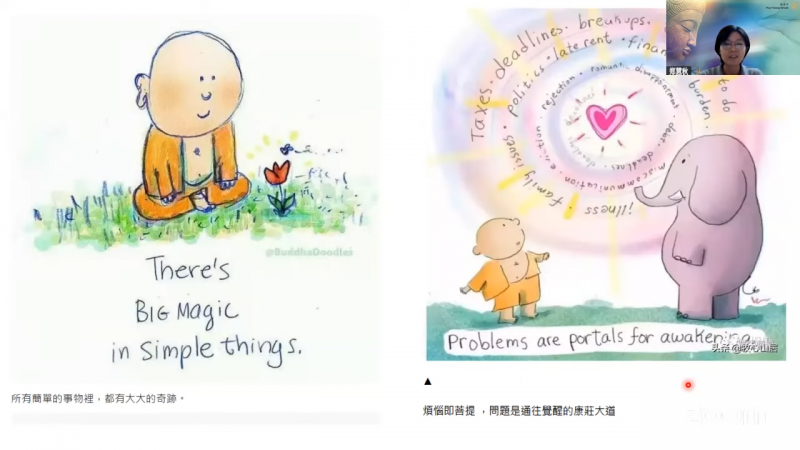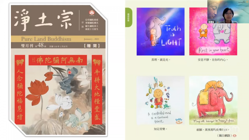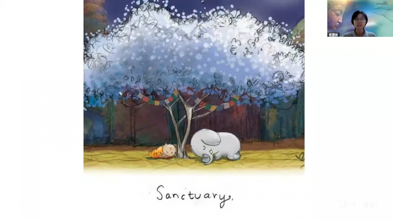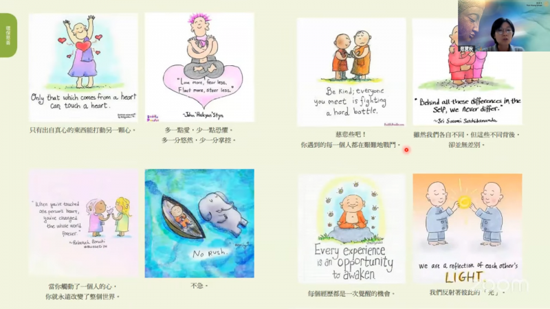 接着,郑慧秋居士带领大家透过荧幕画面来欣赏这位插画家的作品。她觉得特别有佛法韵味的作品,是一张画了一个空旷的树林,感觉这棵树好像就是菩提树,感觉她要表达的就是:有佛法之处就是安身之处,能够皈投依靠佛法是如此幸福的事,因为佛法让我们回归平静。接下来是幅画「Now is enough」,她想要传达的讯息可能就是「要活在当下」以及「简单快乐的定义是什么呢?」就是说,现在的生活,不必想着过去如何,也不用想未来如何,我在当下就已经足够。还有一幅画是两个人在吃着豆腐,这幅画要表达的意思就好像是要告诉我们的意思是,就好像豆腐,你把它粘上什么酱,就会有什么味道。所以,这个也跟我们佛法的教理是很契合的。