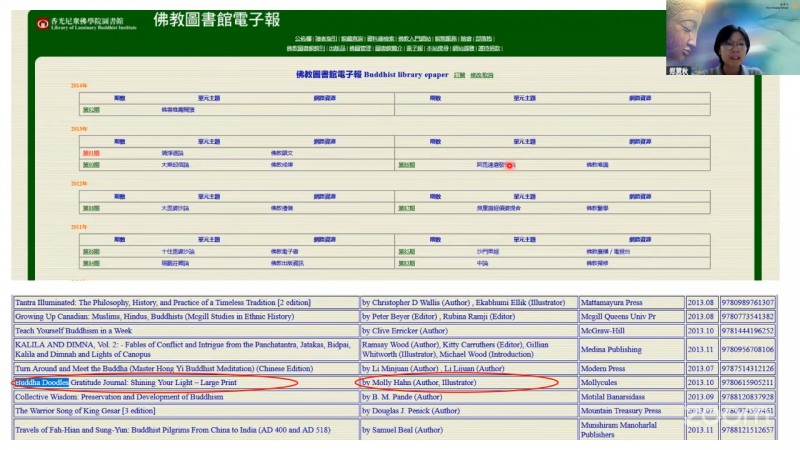 另外,台湾的香光尼图书馆的电子图书馆里面也有收藏她的作品;台湾的《净土宗》杂志也曾经刊登过她的作品,成为了佛法传播的一个新载体,也代表了她的作品得到汉传佛教界的一个认可和欣赏。