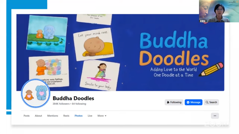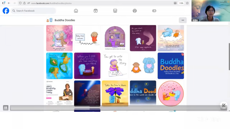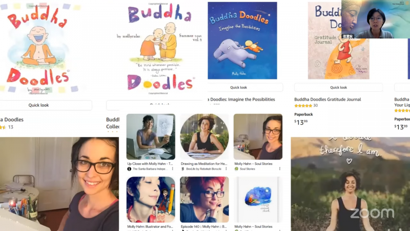 郑慧秋居士表示自己在十年前第一次在Molly的脸书上被她的画吸引了。当时,她的脸书跟随者还不到100人,之后有好几年的时间,她都没有更新她的新作品了(尤其是在疫情时期)。近一两年又开始看到她有重新更新作品。除了Facebook,她也在各个平台,例如:Instagram﹑Twitter﹑ youtube发布她的作品。如今,她的社交网页已收获数十万粉丝,且数字还在增长。大家可以到她的脸书《Buddha Doodles》欣赏她的更多作品。除此之外,Molly的画作也出版成书,大家可以在Amazon购买她的《Buddha Doodles》插画。