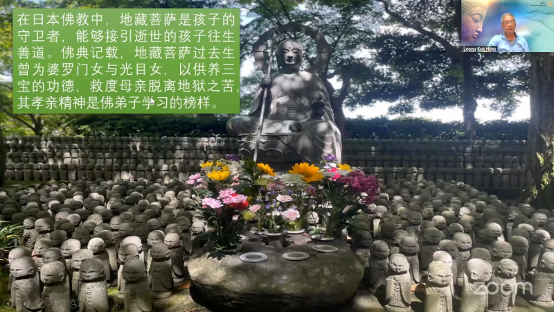 在日本佛教中,地藏菩萨是孩子的守卫者,能够接引逝世的孩子往生善道。佛典记载,地藏菩萨过去生曾为婆罗门女与光目女,以供养三宝的功德,救度母亲脱离地狱之苦,其孝亲精神是佛弟子学习的榜样。