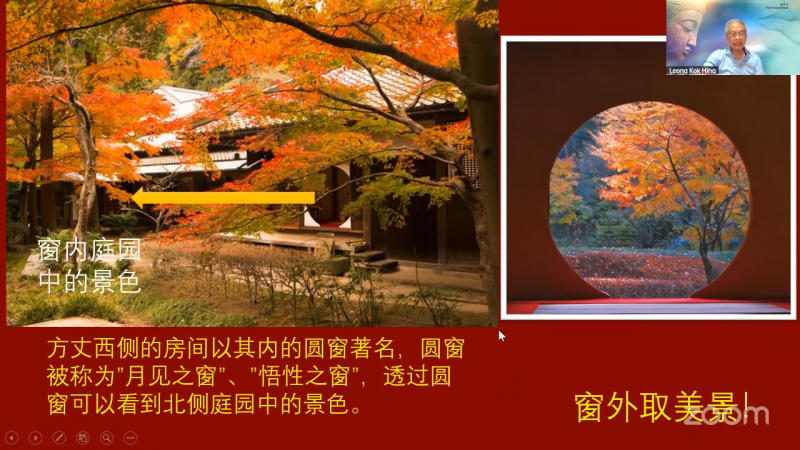 方丈西侧的房间以其内的圆窗著名,圆窗被称为「月见之窗」、「悟性之窗」。透过圆窗可以看到北侧庭园中的景色。