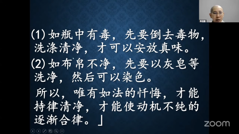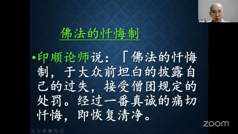 印顺论师说:「佛法的忏悔制,于大众前坦白的披露自己的过失,接受僧团规定的处罚。经过一番真诚的痛切忏悔,即恢复清净。如瓶中有毒,先要倒去毒物,洗涤清净,才可以安放真味;如布帛不净,先要以肥皂等洗净,然后可以染色。所以,唯有如法的忏悔,才能持律清净,才能使动机不纯的逐渐合律。」