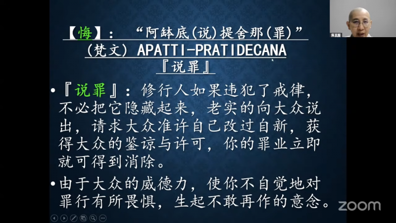 『说罪』:修行人如果违犯了戒律,不必把它隐藏起来,老实的向大众说出,请求大众准许自己改过自新,获得大众的鉴谅与许可,你的罪业立即就可得到消除。由于大众的威德力,使你不自觉地对罪行有所畏惧,生起不敢再作的意念。