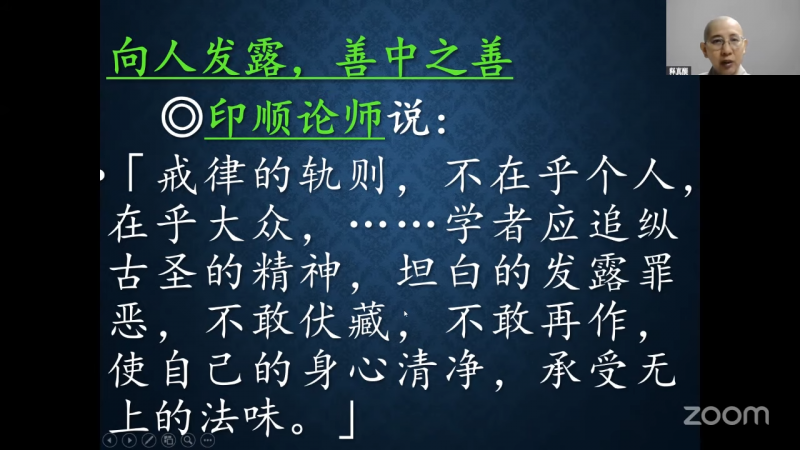 ◎ 印顺论师说:「戒律的轨则,不在乎个人,在乎大众,.......学者应追纵古圣的精神,坦白的发露罪恶,不敢伏藏,不敢再作,使自己的身心清净,承受无上的法味。」