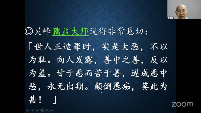 ◎ 灵峰藕益大师说得非常恳切:「世人正造罪时,实是大恶,不以为耻。向人发露,善中之善,反以为羞。甘于恶而苦于善,遂成恶中恶,永无出期。颠倒愚痴,莫此为甚! 」