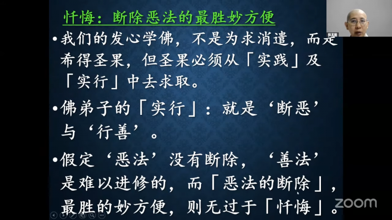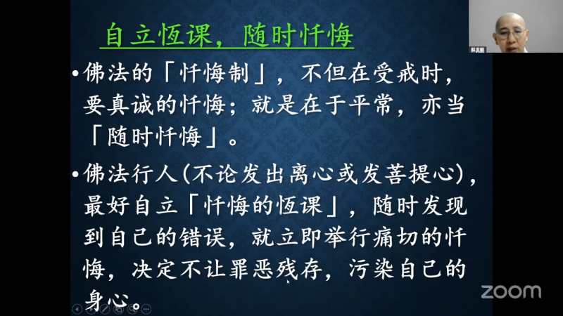 佛法行人(不论发出离心或发菩提心),最好自立「忏悔的恒课」,随时发现到自己的错误,就立即举行痛切的忏悔,决定不让罪恶残存,污染自己的身心。