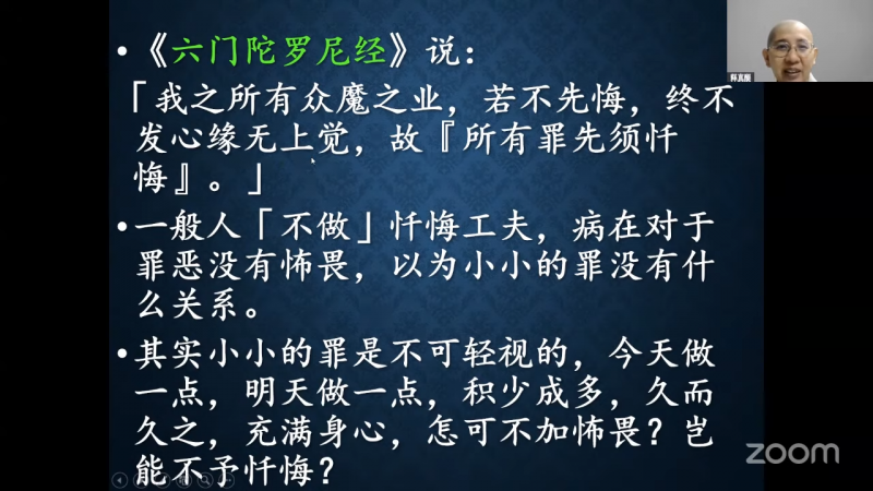 我们的发心学佛,不是为求消遣,而是希得圣果,但圣果必须从「实践」及「实行」中去求取。佛弟子的「实行」就是「断恶」与「行善」。假定「恶法」没有断除,「善法」是难以进修的,而「恶法的断除」最胜的妙方便,则无过于「忏悔」。《六门陀罗尼经》说:「我之所有众魔之业,若不先悔,终不发心缘无上觉,故『所有罪先须忏悔』。」一般人「不做」忏悔工夫,病在对于罪恶没有怖畏,以为小小的罪没有什么关系。其实小小的罪是不可轻视的,今天做一点,明天做一点,积少成多,久而久之,充满身心,怎可不加怖畏?岂能不予忏悔?