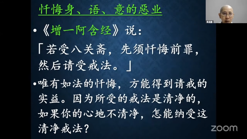 《增一阿含经》说:「若受八关斋,先须忏悔前罪,然后请受戒法。」唯有如法的忏悔,方能得到请戒的实益。因为所受的戒法是清净的,如果你的心地不清净,怎能纳受这清净戒法?