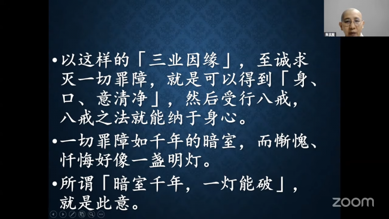 以这样的「三业因缘」,至诚求灭一切罪障,就是可以得到「身、口、意清净」,然后受行八戒,八戒之法就能纳于身心。一切罪障如千年的暗室,而惭愧、忏悔好像一盏明灯。所谓「暗室千年,一灯能破」,就是此意。