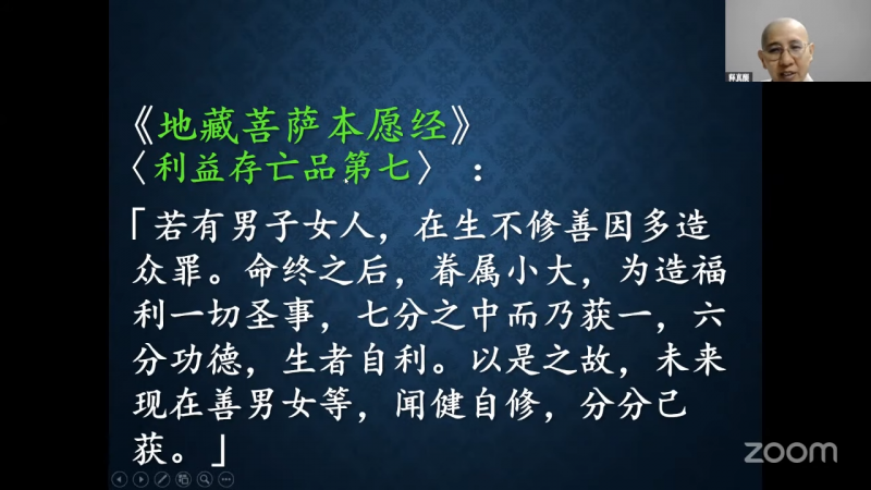 《地藏菩萨本愿经》〈利益存亡品第七〉:「若有男子女人,在生不修善因多造众罪。命终之后,眷属小大,为造福利一切圣事,七分之中而乃获一,六分功德,生者自利。以是之故,未来现在善男女等,闻健自修,分分己获。」
