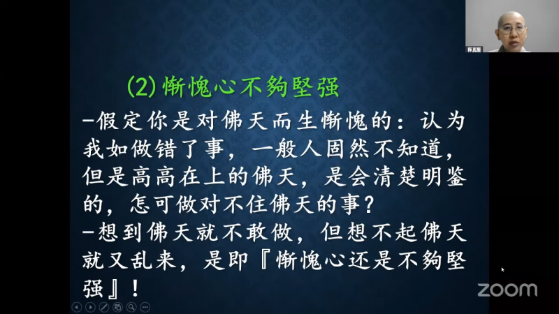 -假定你的惭愧對象,是对师友而生惭愧的:在师友看到你时,你不会做出伤风败德的事;相反的,当师友见不到你时,你就又故态复萌的,去做不如法的事,这即是『惭愧心的力量薄弱』。
