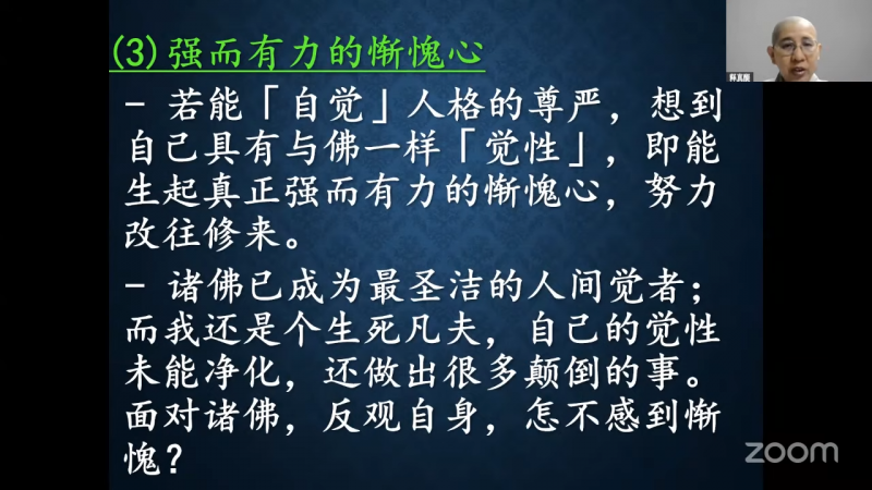 - 若能「自觉」人格的尊严,想到自己具有与佛一样「觉性」,即能生起真正强而有力的惭愧心,努力改往修来。诸佛已成为最圣洁的人间觉者,而我还是个生死凡夫,自己的觉性未能净化,还做出很多颠倒的事。面对诸佛,反观自身,怎不感到惭愧?