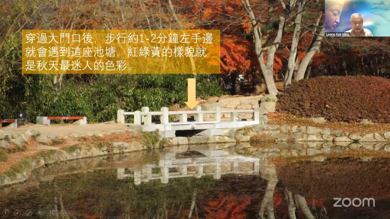 穿过大门口后,步行约 1—2 分钟左手边就会遇到一座池塘,红绿黄的样貌就是秋天最迷人的色彩。