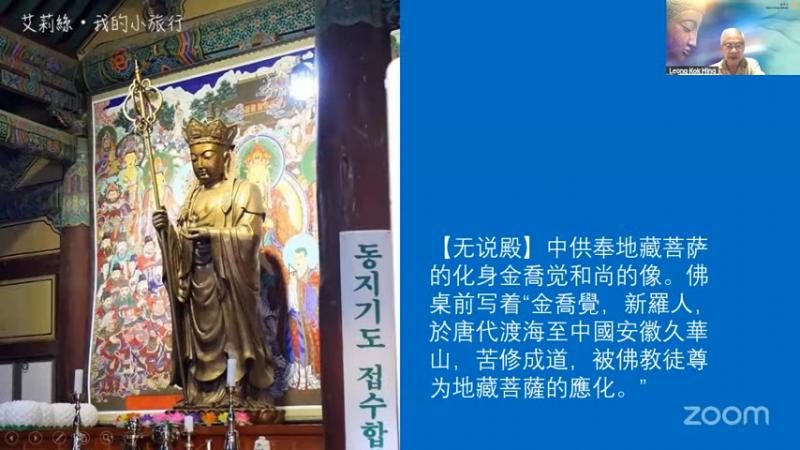 「无说殿」中供奉地藏菩萨的化身金乔觉和尚的像。佛桌前写着「金乔覺,新罗人,于唐代渡海至中国安徽九华山,苦修成道」,被佛教徒尊为地藏菩萨的应化。