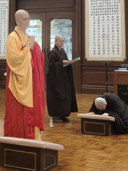 2026年4月6日(星期一,农历二月十九,观音圣诞殊胜之日),慧善法师依止檀香寺开山唯悟法师披剃出家。