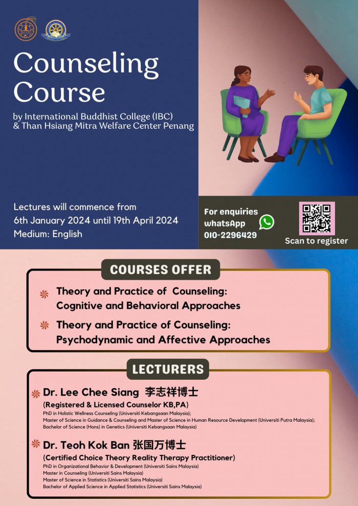由国际佛教大学 ( IBC ) 和槟城檀香爱心福利中心合设的辅导课程。 【媒介语】 英语 【日期】 06/01/2024 – 19/4/2024 【报名详情】 https://tinyurl.com/Ibccourse 【咨询】 https://wa.me/60102296429 7374 reads