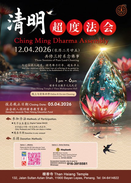 本寺为配合清明节的到来,提倡报恩及思亲的精神,启建【清明超度法会】,共修三时系念佛事一堂并开示佛理,集诸功德,内资法会净土坛上各姓门中历代考妣宗亲,外拔十方法界一切无祀男女孤魂等众,仗此良因,超生净土。