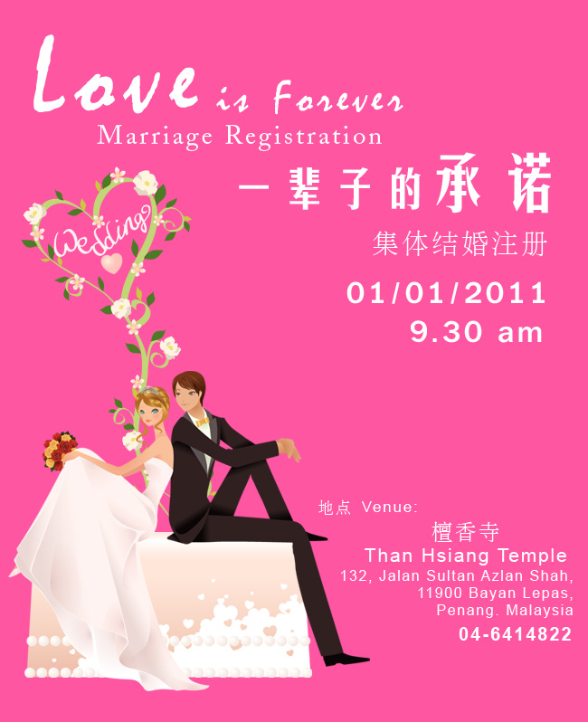 Submitted by Ah Jin on Tue, 16/11/2010 - 14:39 Body: 凡有意于当天注册准新人,请在17/12/2010前把结婚注册申请表格及以下文件交与檀香寺: - 一对准新人身份证复本2份 - 一对准新人出生纸复本2份 - 双方证婚人身份证复本2份 - 若身份证住址属於外州, 需提供公司之证明信2份 - 若曾经离婚,须出示离婚证明书复本2份 - 若是鳏夫或寡妇,须呈交前妻或前夫死亡证书复本2份 宣传 Log in to post comments7134 reads