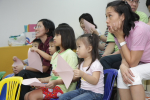 下课午休后进行的就是“大手拉小手”说故事活动,出席的小朋友们都很期待听吴老师说精彩的故事。老师在讲故事前先向小朋友们设下小小的规矩,小朋友们都很听 话的配合老师的要求。当天老师说了四个故事。配合着生动的声音、动作表情,老师的故事讲得一个比一个精彩,不止深深地吸引了孩子们的注意力也吸引了在场的 所有人。除了说故事,老师也教孩子做了简单的手工和手指动作。孩子们出席这个活动不仅可听到老师说好听的故事,还可以与父母们一起做手工、一起玩,个个的 脸上都挂满了幸福的笑容。