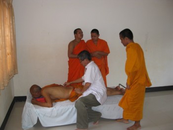 当天晚上八时,邱师兄帶领我们前往拜訪当地一位慈善企业家,潘先生。潘先生是一位成功的商人,热心公益福利慈善事业。此次义诊潘先生就赞助泰銖三万作为医师们的机票費用。潘先生擁有一个美满的家庭,上有八十六高齡的母亲,儿女皆留学海外,帮助打理父亲事业。潘老太太患有糖尿病,膝关节肿痛不良于行,坐在轮椅上,右眼因白内障割除手术失败而失明,左眼亦患有白内障而視觉膜糊。了解病情后,笔者即以针灸治疗她的眼睛与膝关节, 并扶她行走。顷刻之间, 潘老太太的眼睛視觉马上恢复明亮,膝关节也不痛了。老太太連声感谢不已。潘先生一直称赞笔者医术高明,在旁的潘太太看了也要求帮她治疗双手麻痺与颈项酸疼的毛病。笔者除了应用推拿治疗外, 也以针灸帮她治疗,很快就医好了她的病痛。潘先生的家人、女儿、女婿们都要求医师们帮助他们治疗头颈椎的毛病。医师们都一一帮他们解除了这些病痛。之后,潘先生就在当地一间高级餐館宴请我们。