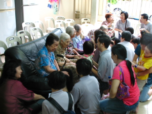 抵达目的地 —— 新港晚晴苑后,招坤师兄便为我们大略讲解该苑的近况。他说由于当天是周日,所以有些老菩萨已经跟着他们的家人回家去享受天伦之乐。除此之外,师兄也解释说办晚晴苑的宗旨不是为了鼓励更多的年轻人将他们家中的老菩萨送到晚晴院后就置之不理,事实上本苑只是暂时代劳,看顾老菩萨的起居饮食;进而减少他们由于单独在家而可能发生的一些意外。晚晴苑里的一些老菩萨偶尔也会偷偷的哭泣,这意味着他们其实是很想念他们的亲人。