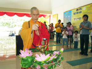 佛陀日当天早上9时30分开始的浴佛法会由维那师父带领130位左右的佛友唱诵《炉香赞》掀开序幕,三称南无本师释迦牟尼佛圣号后,大众唱诵《心经》和《赞佛偈》。接着就是浴佛法会的“高潮”时段——大众在真如法师的带领下,一边虔诚地唱诵《浴佛偈》,一边依次序列队出班浴佛,希望借此能提醒大众通过佛法来清洗干净我们的身、口、意三业。浴佛法会仪式在大众浴佛完毕后维那师父带领大众作三皈依和回向后结束。