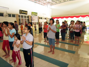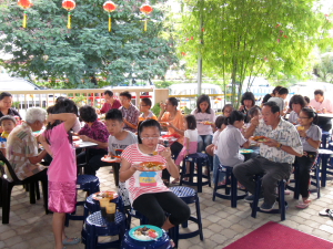 真如法师开示佛法完毕,维那师父就带领大众进行佛前大供和福慧灯回向,之后大众就秩序井然地在大殿前边排队拿食物享用午餐。真如师父和智强师父这时也在佛前分发五色线给佛友并祝福他们。