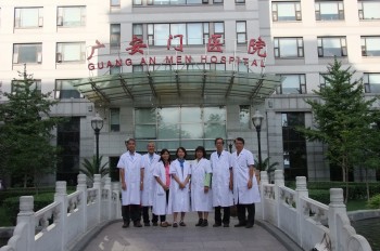 广安门医院原副院长赵田雍教授很早就在门口接待我们, 并由国际部的余主任带我们参观医院研究室。研究室仪器设备非常先进, 具有一流的专业人才进行研究与培训工作。广安门医院是中国中西医结合学会肿瘤专业委员会、中国抗癌协会传统医学委员会、中国癌症研究基金会中医药学会及北京市等多个学术团体的组长单位。医院现设有中医、针灸临床国际培训部,已经为世界各国培训了千余名针灸师。目前该中心开设初级班、高级班及各种培训班,接受针灸、推拿、中医各科、中药、气功等专业的学员来中心学习。