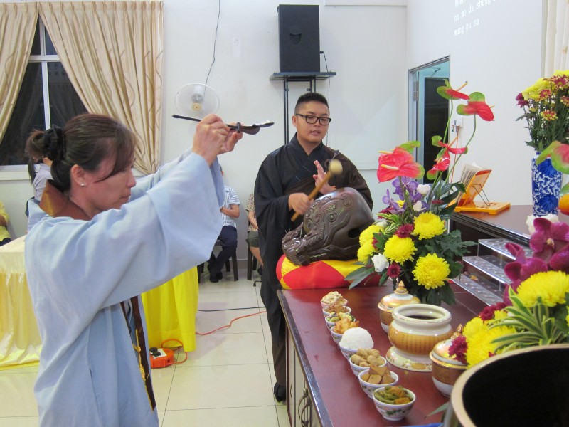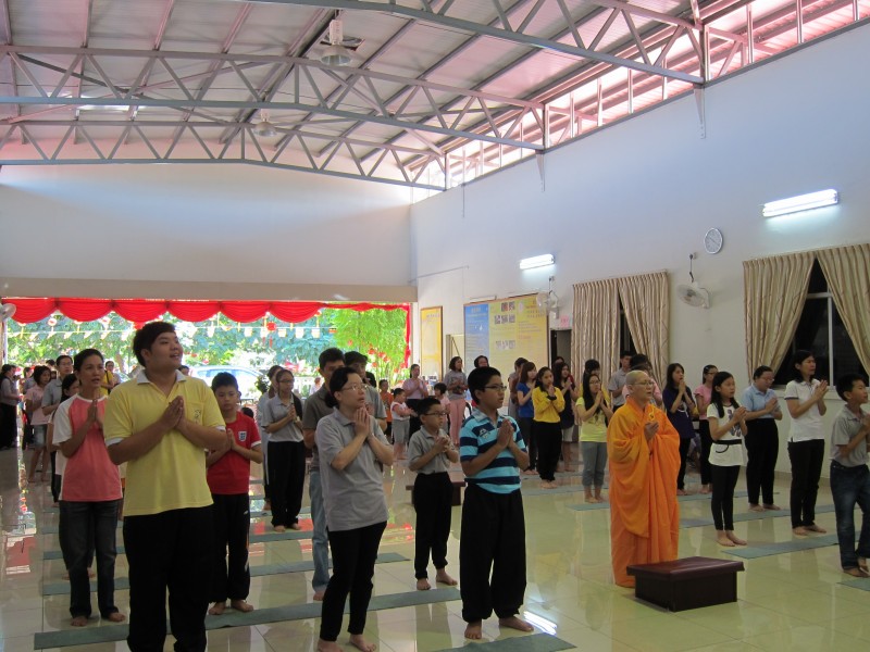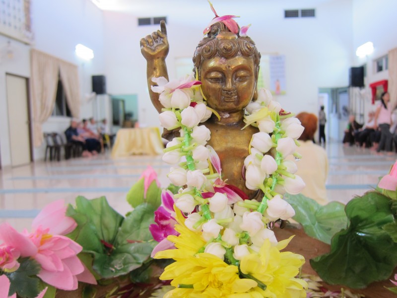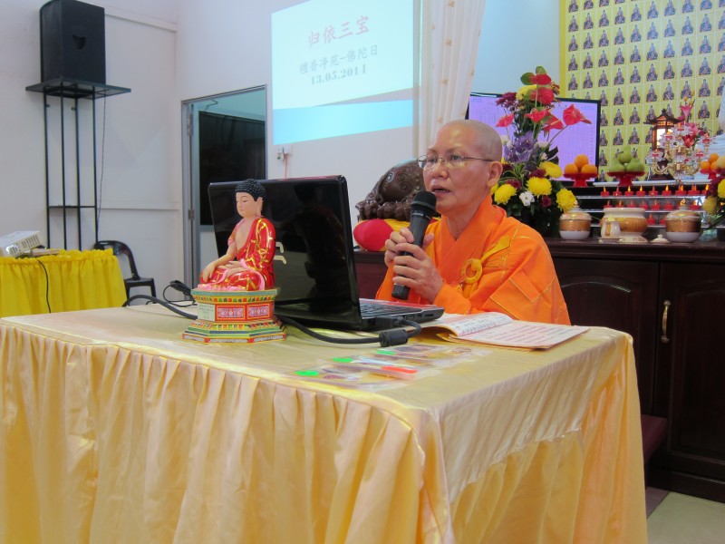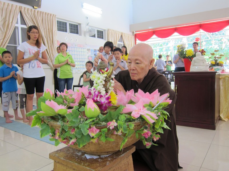 《炉香赞》拉开序幕。接着,大众坐下观赏真信法师播放的两则视频——唯悟法师于2014年5月11日(星期日)在檀香寺浴佛法会的开示内容《浴佛的意义》和《向伊斯兰教刑事法说“不!”》。