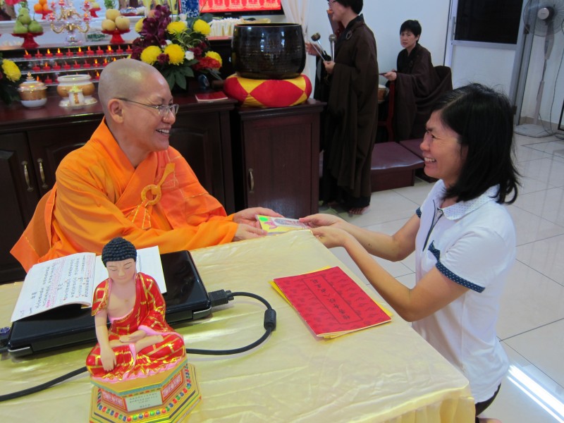 中午12时半,传授三皈五戒的仪式在真信法师的主持下开始了,今年有1位佛友皈依,2位佛友受五戒。师父先向佛友开示三皈五戒的内涵及其利益,再进行传授仪式。受三皈五戒的佛友们向真信法师领取三皈五戒证书后,维那带领大众回向,仪式就圆满结束了。