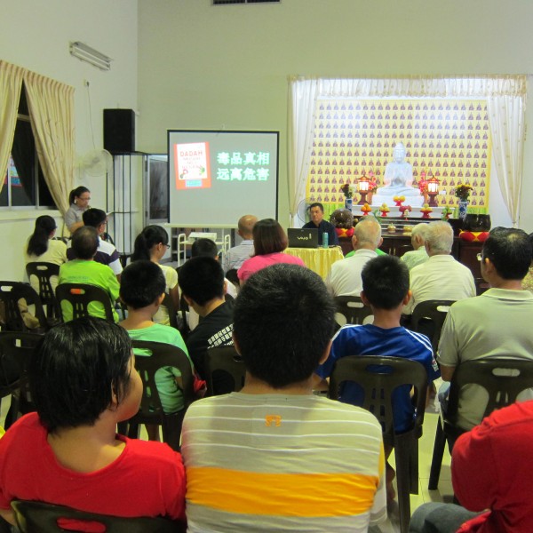 双溪大年檀香净苑于2015年7月13日(星期一)晚上8时15分至9时45分,在檀香净苑大雄宝殿举办毒品醒觉运动讲座,主题为《毒品真相•远离危害》。此项讲座大约吸引了六十位佛友出席聆听。
