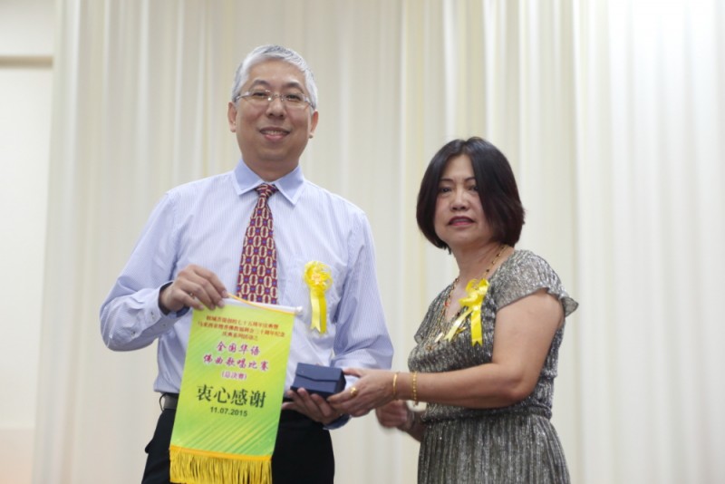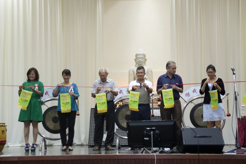 接着,有筹委会主席拿汀吴素玥居士赠送纪念品予5位知名评审及大会赞助商。到了剪彩的环节,大会有请善心仁翁上台进行剪彩仪式,拉开比赛的序幕。接着鸣锣、击鼓、献灯仪式的环节陆续进行后,全国华语佛曲歌唱总决赛正式开始。
