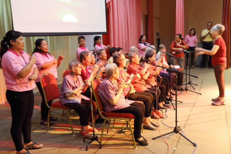 “咔擦!”一个按钮,一声快门,全体职员的欢喜永久保鲜。接着下来的压轴余兴节目是新港晚晴苑老菩萨们诚意为大家献上的合唱(口琴伴奏)表演。老菩萨们带来的歌曲有“晚晴苑之歌”、“弥陀花鼓”、“阿弥陀佛力量大”及“You are my sunshine”。